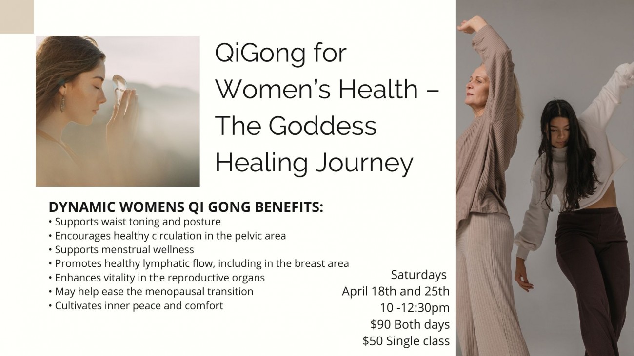 QiGong for Women’s Health – The Goddess Healing Journey with Angela Sokolova Saturdays April 18th and 25th 10am -12:30pm $90 for both classes $50 singla class Would you like to invest your prec...